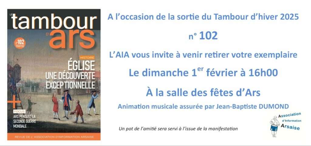Dimanche 1er février 2026, le tambour numéro 100 sera distribué à la salle des fêtes d’Ars à partir de 16h00 aux adhérents et partenaires. Une animation musicale sera proposée par Jean-Baptiste Dumond.